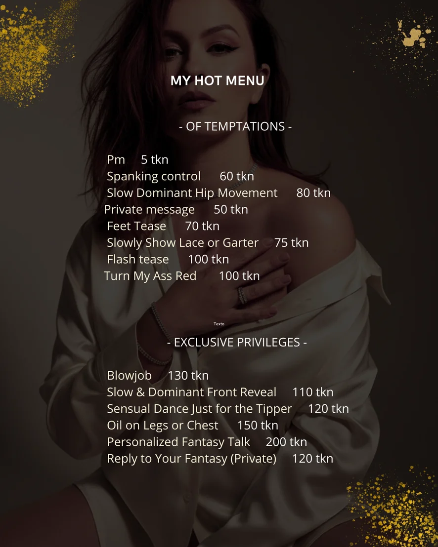 Gătit, Dus, Facial, Lingere vagin, Yoga, În aer liber, Plesnire, Dans Erotic, Masturbare cu degetele, Discutii murdare, Felație, Masaj, Sex între sâni, Topless, Anal, Cumshot, Dildo sau Vibrator, Fetis Picioare, Sex oral in adancime, Umilire, Joc de rol, Jucarii Sexuale, Masturbare, Orgasm, Pantofi cu toc